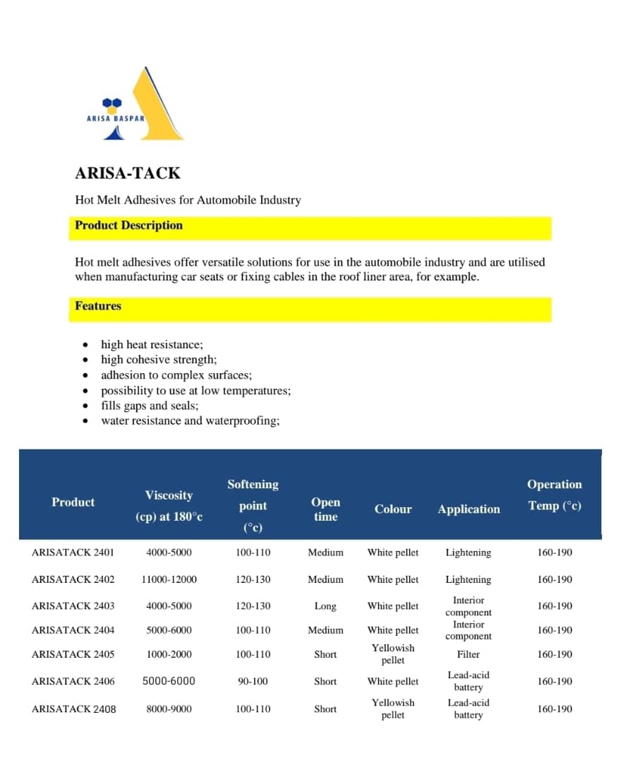 هات ملت باتری خودرو در خط مونتاژ باتری خودرو استفاده میشود. چسبی ضد اسید با قدرت چسبندگی بسیار زیاد و زمان خشک شدن زیر ۳۰ ثانیه میباشد. استفاده از هات ملت باتری خودرو ضروری است. چسب های حرارتی در صنعت خودرو کاربرد وسیعی دارند و در هر دو مونتاژ داخلی و خارجی آن استفاده می شوند. چسب های مختلف مبتنی بر حلال که برای فضای داخلی خودرو استفاده می شوند، پاسخ گوی نیاز مشتریان نیستند زیرا مشتریان خواستار ویژگی هایی چون انعطاف پذیری بالا و مقاومت در برابر گرما هستند. از سوی دیگر چسب های مبتی بر حلال بر محیط زیست تأثیر می گذارند و کنترل فرآیند را پیچیده می کنند. شرکت آریسا بسپار پارس برای برطرف کردن این مشکلات، چسب های حرارتی که واکنش ناپذیر و غیر قابل حل هستند را ارائه داده است. از این چسب ها در اتصال و عایق بندی چراغ خودرو، اتصال پنل درب، نمد، برف پاک کن، چسباندن تودوزی صندوق عقب، نوارهای درزگیر، فیلتر خودرو و باتری خودرو استفاده می شود.