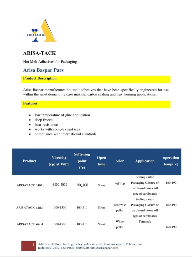 این نوع از چسب های حرارتی بسیار کارآمد بوده و به انواع مواد مقوایی از جمله مقوا بازیافتی و انواع سطوح مانند پلی پروپیلن، پلی اتیلن، سطوح روکش شده با موم و ورقه های PET کاملاً می چسبد. چسب های حرارتی تولیدی توسط شرکت آریسا بسپار پارس که در صنایع بسته بندی مورد استفاده قرار می گیرند با اکثر دستگاه های بسته بندی، درسرعت های تولید متفاوت، سازگار است و دانش فنی و به روز این شرکت سبب شده است این اطمینان را به مشتریان دهیم که این نوع از چسب ها در تماس مستقیم با محصولات غذایی هیچ گونه مشکلی ایجاد نمی کنند. هدف نهایی آریسا بسپار تولید محصولات با کیفیت همراه با ویژگی های مطلوب زیر به منظور جلب رضایت مشتریان می باشد.